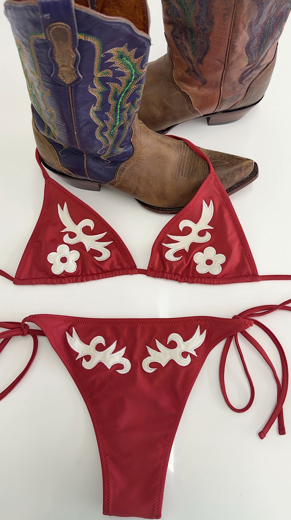 Our signature appliqué bikini bottom, reimagined with a western edge in rich cognac. Designed to stand out, this piece features motifs inspired by vintage cowboy boots, blending americana with a modern, elevated sensibility. A subtle placement at the back nods to iconic early-2000s allure—for those who love the look of back dimples or a tramp stamp, without the lifelong commitment. Designed in our buttery-soft, recycled fabric and finished with nostalgic zigzag stitching, this timeless string bikini bottom offers just-right coverage and an ultra-flattering, adjustable fit.