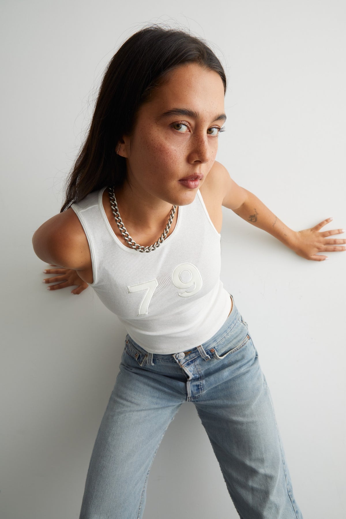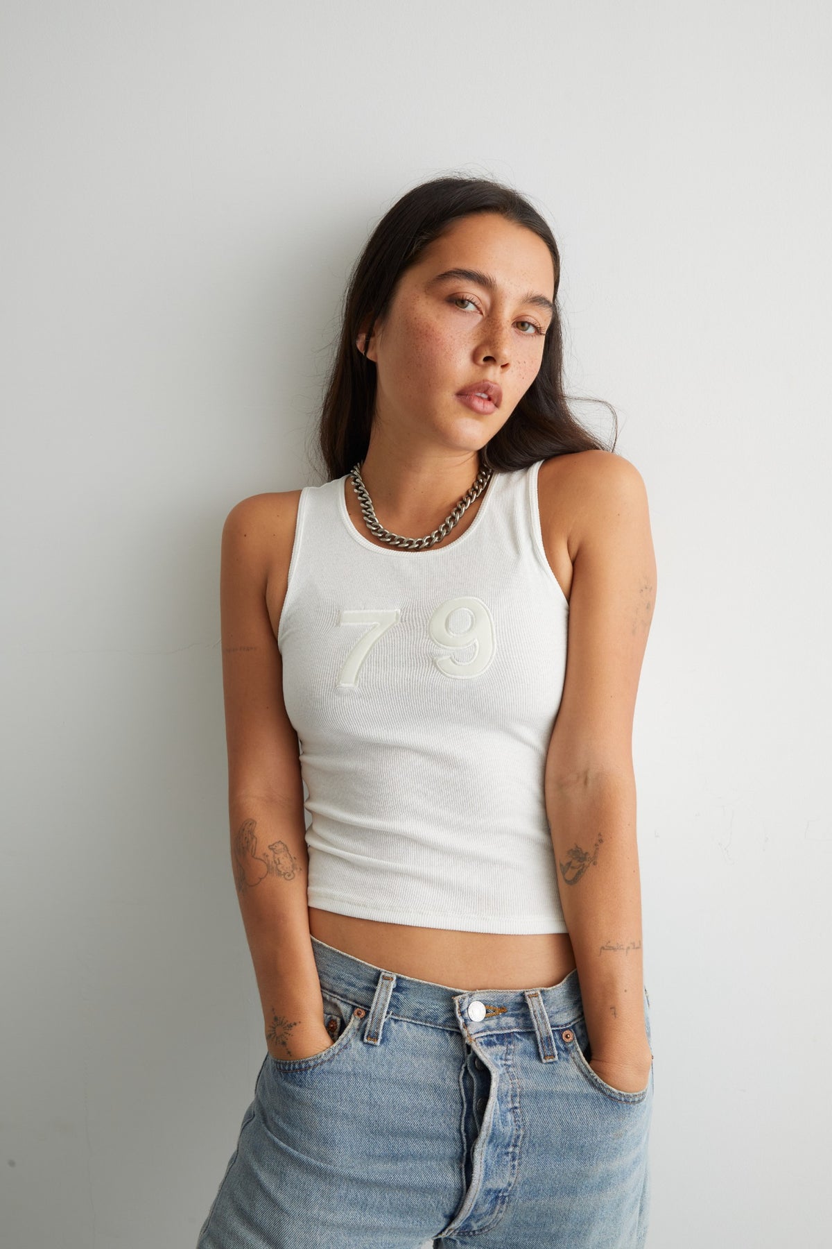 Your new favorite staple with a little something extra. Crafted from a soft, stretch rib with a close-to-the-body fit, it’s finished with our signature “79” tonal appliqué — an understated nod to nostalgia and heritage. Designed with the proportions of a vintage ribbed tank, this piece is cut to sit cleanly on the body while offering thoughtful coverage that discreetly conceals bra straps.